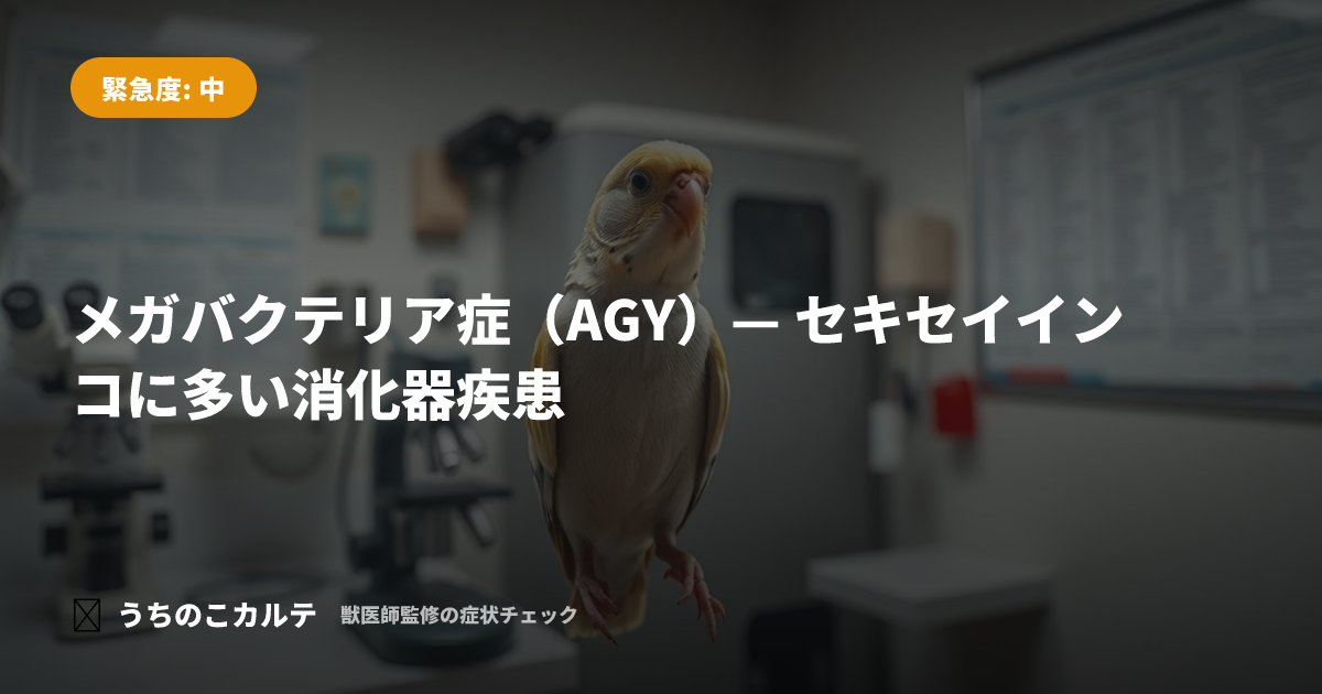 AGY(Avian Gastric Yeast)は Macrorhabdus ornithogaster という真菌が胃に感染する疾患です。セキセイインコに特に多く見られ、嘔吐や体重減少、未消化便などの消化器症状を引き起こします。