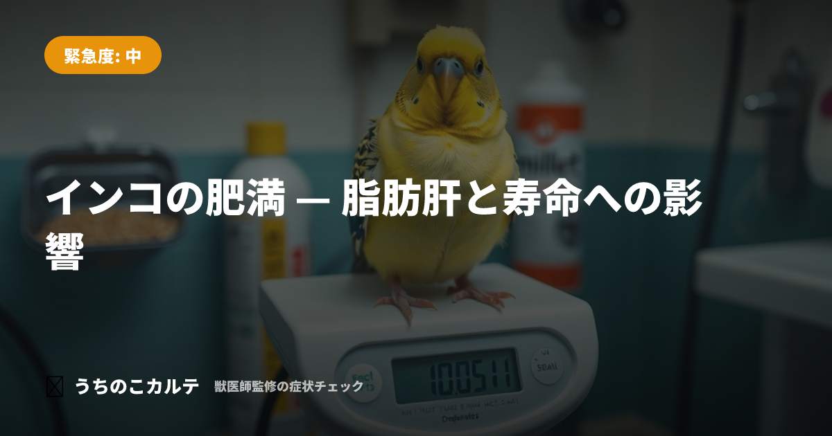 インコの肥満は飼い鳥で非常に多い問題です。肥満は脂肪肝、心臓病、関節障害など多くの疾患の原因となり、寿命を大きく縮めます。適切な食事管理と運動で予防・改善しましょう。