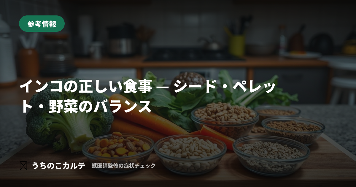 インコの食事は健康に直結します。シード偏食は肥満や脂肪肝、ビタミン欠乏の原因になります。ペレットを主食に、野菜を副食とするバランスの良い食事を目指しましょう。