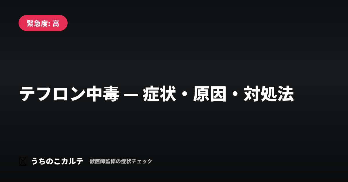 テフロン(フッ素樹脂)加工品を加熱した際に発生する有毒ガスで鳥が中毒を起こす緊急事態です。数分で致死的になることがあり、突然の呼吸困難や急死に至ります。鳥の飼育環境からテフロン製品を完全に排除することが唯一の予防法です。